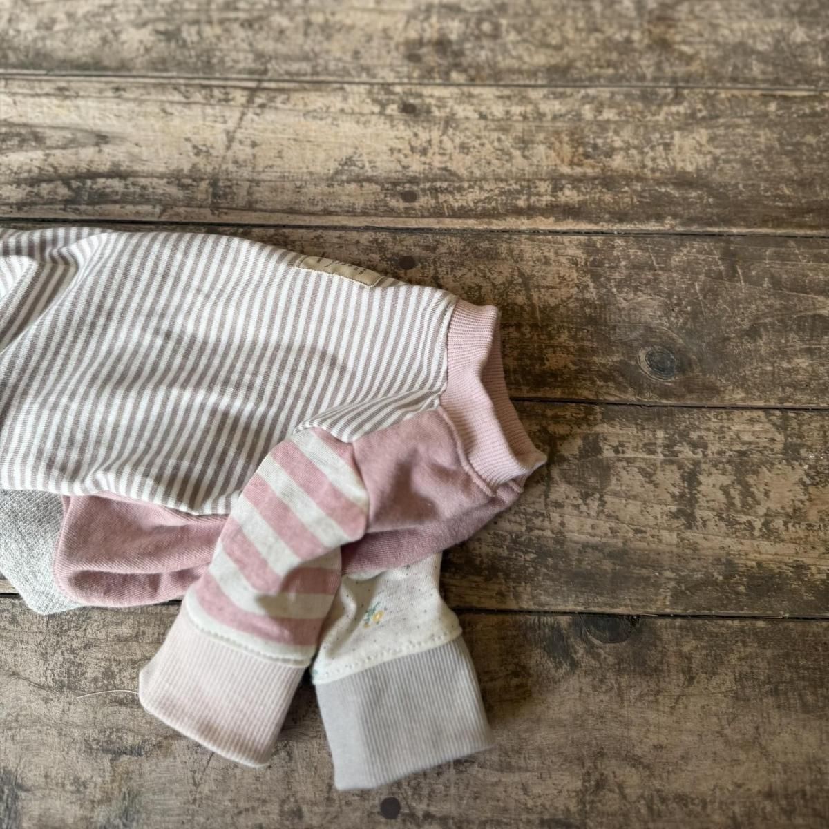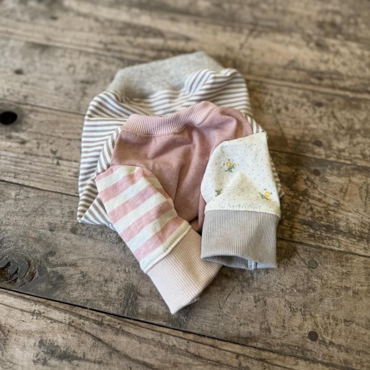 ナチュラルなくすみカラーのボーダー生地に、袖はピンク・ボーダー・小花柄を組み合わせたやさしい雰囲気の一着。