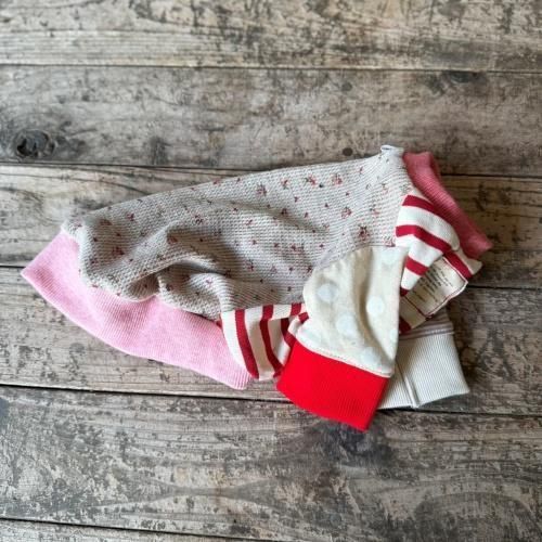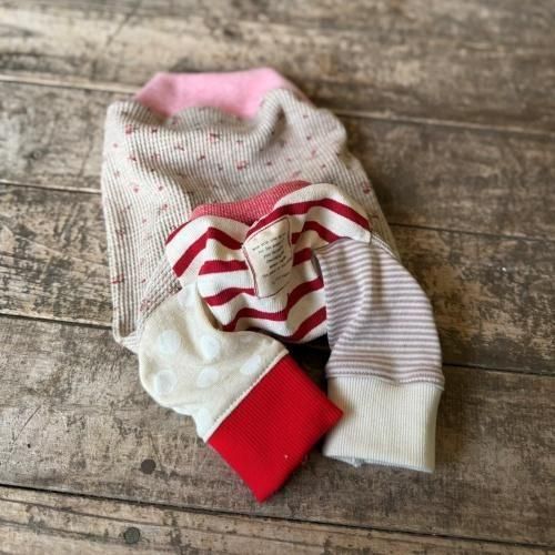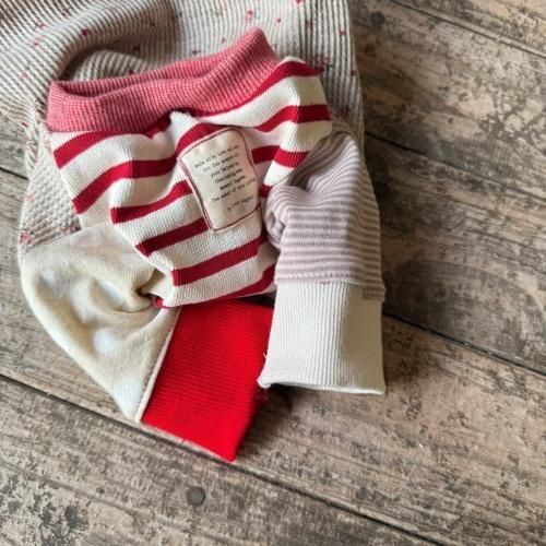 袖は赤ボーダーやドット柄を切り替えて、ナチュラルさの中に遊び心をプラスしました。