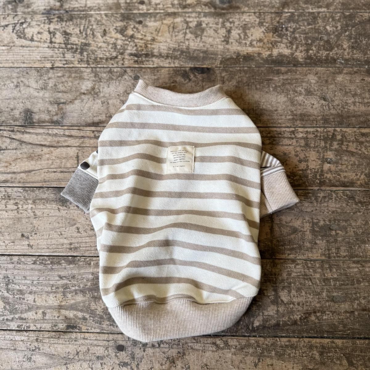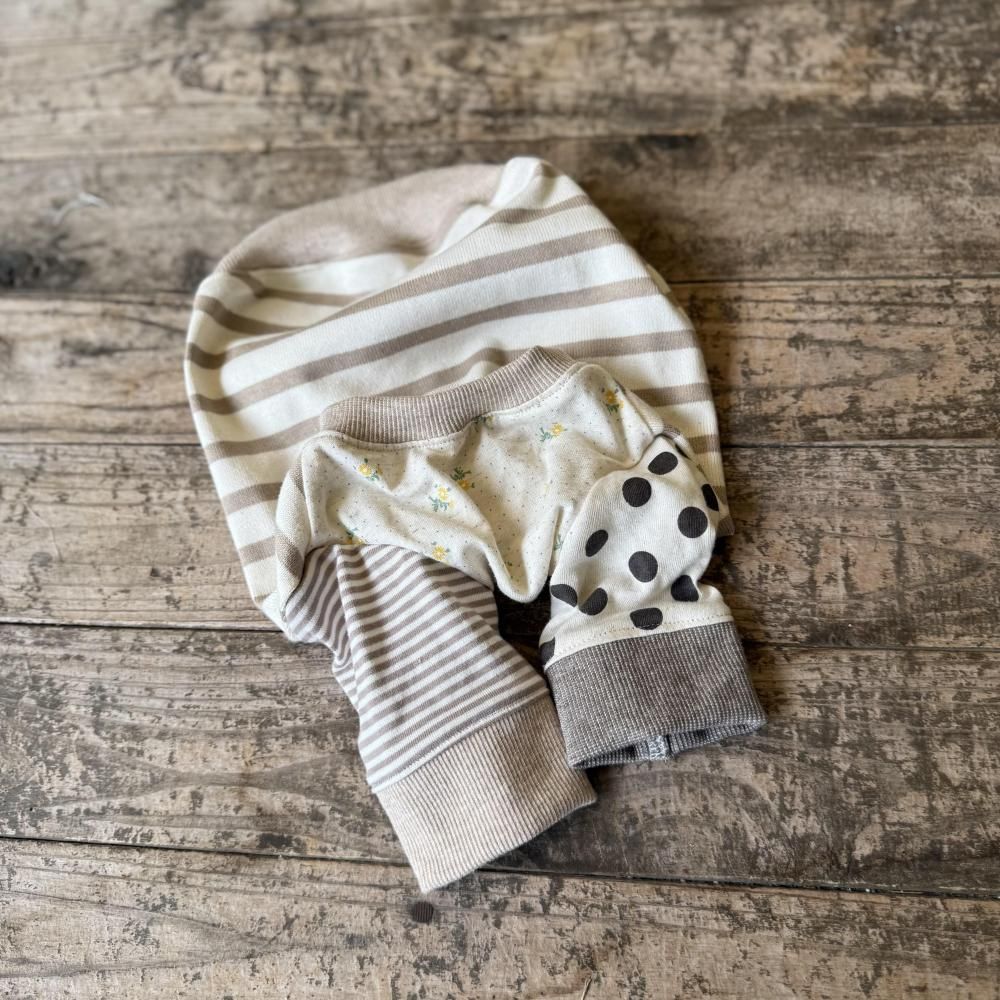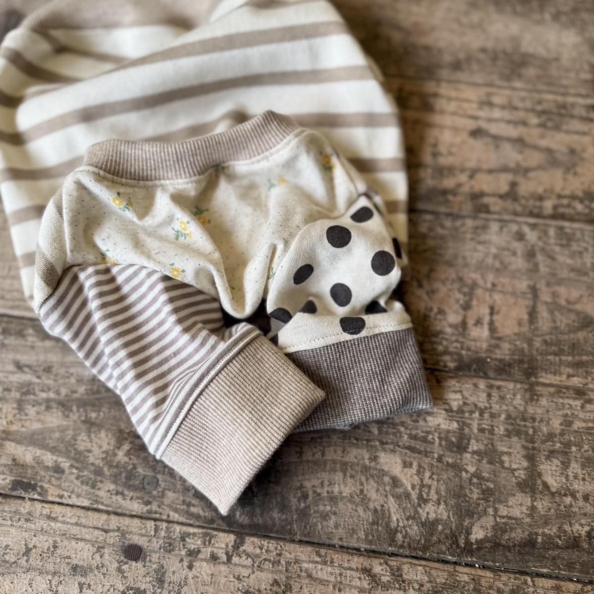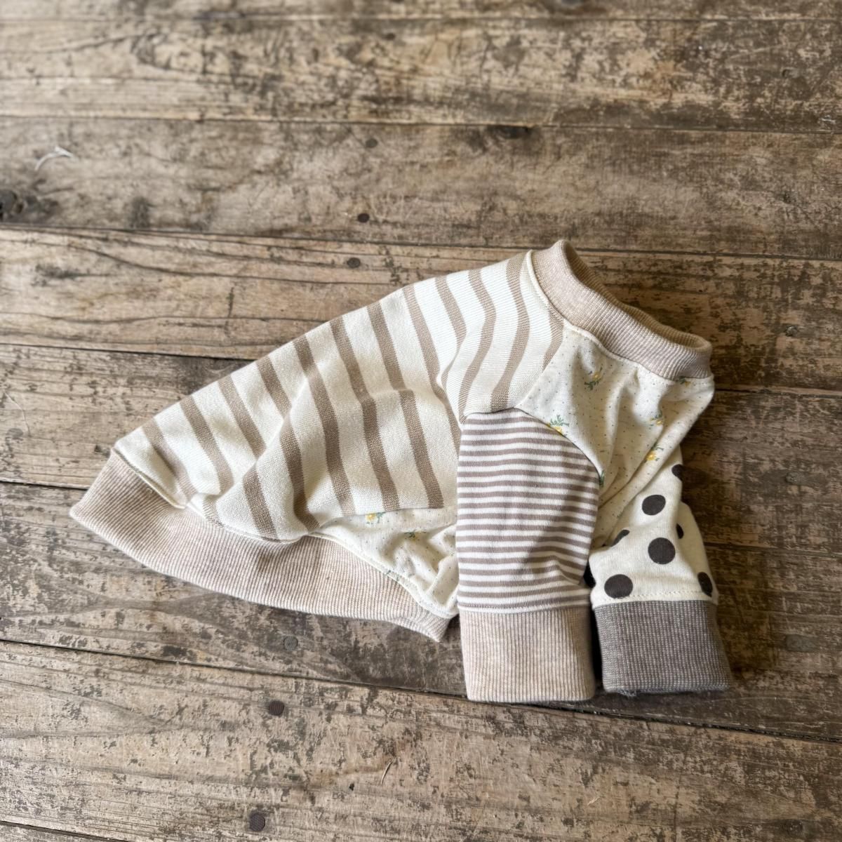 落ち着いたベージュボーダーに、小花柄・ドット・ボーダーを合わせたやさしいコンボT。